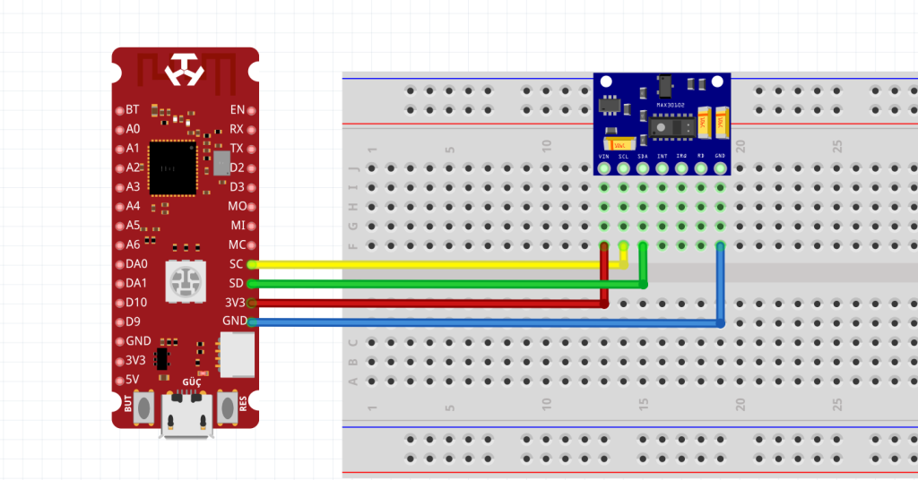MAX30100 sensörü, Deneyap Kart ile I2C haberleşme protokolü üzerinden iletişim kurar. Bu, sadece iki adet veri kablosuyla bağlantı kurabileceğimiz anlamına gelir. Bağlantılar oldukça basittir: